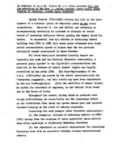 Lyulph Stanley (1839-1925) devoted his life to the development of a national system of education under ad hoc oivic authorities. Educated at Etos and Balliol and embracing an uncompromising radicalism he assisted in attempts to divest Oxford of sectarian influence before joining the School Board for London. So successful were his efforts at initiating school building from 1879 to 1885 that those years witnessed more board school accommodation opened in London than the two greatest provincial boards constructed in three decades. The Cross Commission Extended Minority report was basically his work and the National Education Association, a pressure group opposed to tho Majority's recommendations and vigilant in the defence of school boards rights gas largely controlled by him until 1898. His Vice-Chairmanship of the S.B.L. (1897-1904) was narked by the crisis associated with tho 'Cockerton Judgments', end this crisis may have been exacerbated by his own forth rightness. After tho abolition of school boards, he worked for education in Anglesey, on the Central Welsh Board and in the House of Lords. Throughout his career, during which he produced over thirty publications, ho persistently saw the elementary school as the institution from which the system should grow and improved teacher-training as the means of raising standards. Evaluating his work prompts these tentative conclusions :-(a; the financial weakness of voluntary schools (c, l880-1902) sprang from the meanness of their supporters whose motives were often unrelated to furthering Christian education (b) the Department on occasion administered the Elementary Education Acts with an excessive leniency towards denominational schools. (o, in the countryside the Department could have (i) created more suitable units by amalgamating small school boards and (ii) prevented tho unnecessary multiplication of small schools(d) some of tho administrative units created in 1902 were over-large (a) the development of the best elementary schools was sometimes thwarted until too late (e.g. in London) thereby rendering "parity of estoem" less likely in subsequent reorganisations.