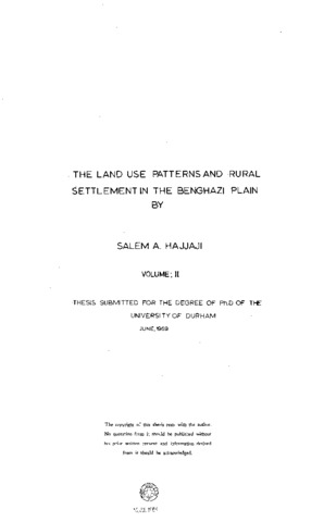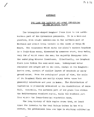 The triangular-shaped benghazi plain lies in the north western part of the cyrenaican peninsula. It is a wave-cut platform, with slight undulations in the northern part or Es-Sahel and almost level terrain in the south or Barga El Hamra. The escarpment which marks the plains eastern boundary is a fault-line scarp, dissected by numerous short, deep wadis, very few of which reach the sea; the majority disappear into the underlying Miocene limestones. Climatically, the Benghazi plain lies within the semi-arid zone. underground water resources are meagre and in the main, Underground water resources are meagre and in the main, except in the Benghazi- Benina area, consist of shallow layers of brackish or salty ground water. From the pedological point of view, the soils of the Benghazi plain are mostly clayey terra rossa but generally calcareous and poor in humus. The distribution of vegetation is primarily determined by the distribution of rainfall. Generally, the northern part of the plain lies within the Mediterranean woodland region, while the southern part lies within the Irano-Turanian vegatation type. The long history of this region shows that, at least since the invasion by the Beni Sulaim tribes in the 11th century, the predominant land use type is shifting cultivation cereals and animal husbandry; some irrigated farming is traditional in the coastal area where underground water is available. Here the rural settlements are clustered and the farmers practise a subsistence type of farming. The rural population is dispersed in pattern and few in number; the tenure of the land is tribal or communal, but in theory is vested in the State. The agricultural development is handicapped by the scarcity of irrigation water. Thus, any future economic development must depend primarily on the availability of good water. However, the construction of El Gwarsha Sewage Purification Plant and Wadi El Gattara Water Dam will undoubtedly provide good irrigation water for at least 2,500 ha. of virgin land. The El Gwarsha Land Settlement Scheme has already been planned and initiated under the supervision of N.A.S.A. However, the El Gattara Land Settlement Project has been proposed in the conclusion of this thesis. This project is designed according to a co-operative or joint type of farming, which the author believes best suits the Bedu way of life. The most striking result of these two land settlement projects is that, if they succeed as is planned, they will provide Benghazi with its requirements for agricultural products, except meat and some grains. At present more than 80 per cent of these needs are imported from Tripolitania and abroad. In addition to these benefits, the El Gattara project will aid in the sedenterisation of the nomads and semi-nomads in the area.