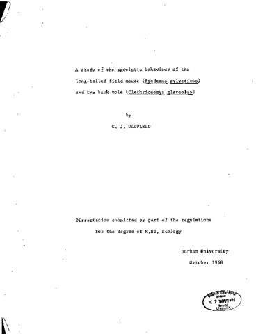 A study of the agonistic behaviour of the long-tailed field mouse (Apodemus sylvaticus) and the bank vole (Clethrionomys glareolus).
