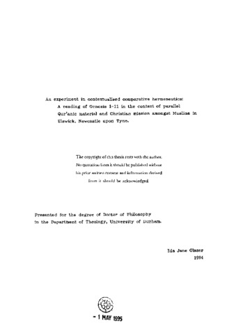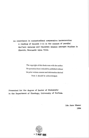 An experiment in contextualised comparative hermeneutics : a reading of Genesis 1-11 in the context of parallel Qur'anic material and Christian mission amongst Muslims in Elswick, Newcastle upon Tyne.
