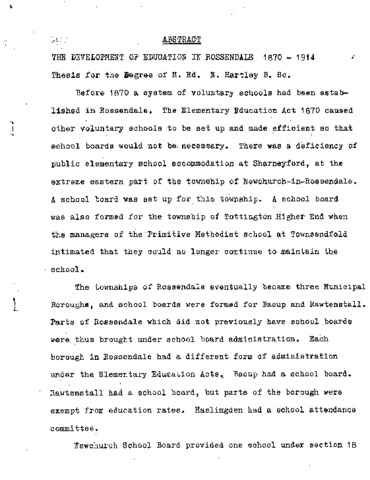 Before 1870 a system of voluntary schools had been established in Rossendale. The Elementary Education Act 1870 caused j other voluntary schools to be set up and made efficient so that school boards would not be. necessary. There was a deficiency of public elementary school accommodation at Sharneyford, at the extreme eastern part of the township of Newchurch-in-Rossendale. A school board was set up for this township. A school board was also formed for the township of Tottington .Higher End when the managers of the Primitive Methodist school at Townsendfold intimated that they could no longer continue to maintain the school. The townships of Rossendale eventually became three Municipal Boroughs, and school boards were formed for Bacup and Rawtenstall. Parts of Rossendale which did not previously have school boards were, thus brought under school board administration. Each borough in Rossendale had a different form of administration under the Elementary Education Acts. Bacup had a school board. Rawtenstall had a school board, but parts of the borough were exempt from education rates. Haslingden had a school attendance committee. New church School Board provided one school under section 18 of the 1870 Act. Bacup and Rawtenstall School Boards took over several voluntary schools. Some of these were replaced by new buildings. The three municipal boroughs administered technical education under the Technical Instruction Act 1889 Lancashire County Council distributed the "Whisky Money" and required the municipal] boroughs to submit plans of their schemes of technical instructic for approval. Bacup and Rawtenstall carried out their Technical instruction in very inefficient premises. Haslingden built a new technical school in 1903.Under the 1902 Education Act, the three municipal boroughs became Part III authorities for elementary education. Lancashire County Council became the Part II authority for secondary education. The municipal borough education-committees assumed responsibility for secular education and there were several disputes with the vaduntary schools. In Bacup and Rawtenstall, schools taken over were improved where possible and some new schools were built. Haslingden would not take over any voluntary schools, but provided new buildings. Haslingden Technical school became a secondary school. A gupil Teachers Centre at Waterfoot and Newchurch Grammar school were amalgamated to become the Bacup and Rawtenstall Secondary and Technical school.