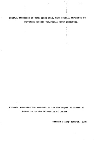 Liberal education in York since 1815, with special reference to provision for non-vocational adult education.