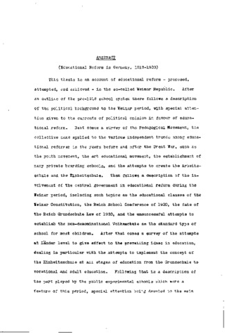 This thesis is an account of educational reform – proposed, attempted, and achieved – in the so-called Weimar Republic. After an outline of the pre-1918 school system there follows a description of the political background to the Weimar period, with special attention given to the currents of political opinion in favour of educational reform. Next comes a survey of the Pedagogical Movement, the collective name applied to the various independent trends among educational reformer in the years before and after the Great War., such as the youth movement, the art educational movement, the establishment of many private boarding schools, and the attempts to create Arbeitsshule and the Einheitschule. Then follows a description on the involvement of the central government in educational reform during the Weimar period, including such topics as the educational clauses of the Weimar Constitution, the Reich School Conference of 1920, the fate of the Reich Grundschule Law of 1920, and the unsuccessful attempts to establish the non-denominational Volksschule as the standard type of school for most children. After that comes a survey of the attempts at Lander level to give effect to the prevailing ideas in education, dealing in particular with the attempts to implement the concept of the Einheitschule at all stages of education from the Grundschule to vocational and adult education. Following that is a description of the part played by the public experimental schools which were a feature of this period, special attention being devoted to the main centres of such activity - Hamburg, Bremen, and Berlin. The last chapter looks at reform in the universities and at the not inconsiderable changes made in the arrangements for training Volksschule teachers. The conclusion sets out to define the essential spirit of educational reform in the Weimar Republic and to assess its significance for German education since 1945.