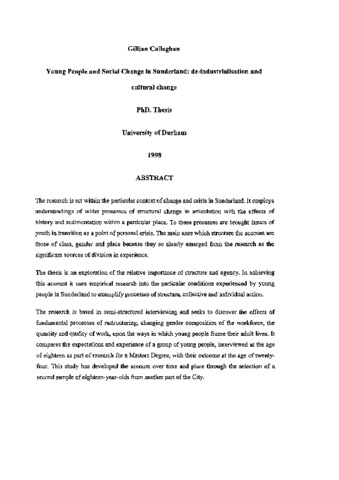 Young people and social change in Sunderland : de-industrialisation and cultural change.