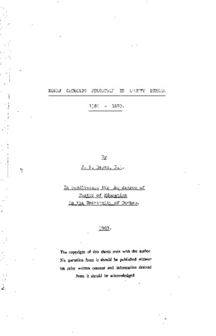 The thesis examines the education of Catholic youths in penal times and links their education with the activities of the missionary priests and the recusant parents, who found means of primary education in the humanities before sending their sons abroad to be educated. The possibility of a clandestine school in Dalton-le-Dale in 1641 is considered, and an account is given of the attempts at organised education in Durham and Gateshead during the reign of James II. Source material is used to show where Catholic teachers practised in the eighteenth century and how schools were often linked with the foundations of missions. Support by the Catholic gentry for private education for rich and poor is examined, and there is a comprehensive account of the foundation at Tudhoe, its system of education, its links with Crook and Ushaw and its subsequent history as a Poor Law school. Education at Crook and Ushaw is treated as an integral part of the development of Catholic education in the county. Family papers are used to describe the education abroad in the late eighteenth century of a young Catholic gentleman (W. T. Salvin), and this account can be compared with the education of his own children in the early nineteenth century in a chapter that deals with private foundations at Stockton-on-Tees and Darlington. A major part of the thesis is concerned with the growth of the Catholic poor schools of the nineteenth century and their connections with the early missions. Original sources are used to trace the development of all the Catholic schools in the county and to compare their growth with national progress. It has been possible to give detailed accounts of all the Catholic poor schools in Durham, to chart their progress, examine their means of support and their qualification for grant, and to describe the way the Catholic teachers became qualified.