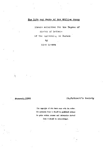 Chapter One; The Early Years. Jones's childhood, his schooling and character; to the age of twenty two. Chapter Two; Early Works. His developing interest in eastern literature; his first publications and early critical theory; taken to 1774. Chapter Three; Politics and the Law. His career as a politician and lawyer; taken to 1783. Chapter Four; Jurisprudence, translation and Poetry. His juridical writings; some aspects of his abilities as a translator and poet; from 1768 to 1785. Chapter Five: The first Years in India. His first years in India; outlook on the cultures, religions and peoples of India; attitude towards missions; discussion of his Hymns. Chapter Six; Sanskrit Studies. The beginnings of Sanskrit study; the hypothesis of a link between Indian and European languages; the translations from ancient Hindu writings; his works on anthropology and attempts to create a Hindu chronology. Chapter Seven; The Later years in India. Other important works undertaken during his stay in India; taken to 1794 and his death. Chapter Eight; His Literary Influence. Some aspects of his influence on the writers who followed, especially on Shelley, Coleridge, Southey and Tennyson.