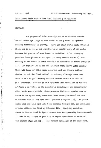 ihe purpose of this investigation is to examine whether the different spellings of some forms of III-y verbs in Ugaritic reflect differences in meaning. There are about fifty roots attested which end in y; it is not possible to be exactly sure of the number because the parsing of some forms is tentative. After surveying previous descriptions of the Ugaritic III-y verb (Chapter I) the meaning of the verbs in their contexts is discussed in detail (Chapter II). The examination of all the attested forms shows quite clearly that yqtl forms of III-y verbs describe past and future actions, whether or not the final radical is written, although there does seem to be a slight tendency for the shorter form to be used in past narration. Because of this apparent free variation in the use of final y in verbs, it was decided to investigate how consistently other words were spelled. Those passages that are repeated once or twice in the myths have, therefore, been closely examined and the variations within them have been tabulated (Chapter III). The place names that end in y have also been examined because they are sometimes written without the final –y (Chapter IV). Spelling variation seems to have existed in Ugaritic more than has generally been supposed. If this is so, it may be possible, to regard some forms of verbs of the pattern ybky and ybk as variant spellings of the same word.