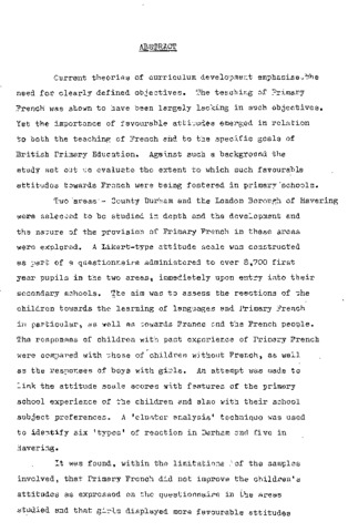 Current theories of curriculum development emphasise the need for clearly defined objectives. The teaching of Primary French was shown to have been largely lacking in such objectives. Yet the importance of favourable attitudes emerged in relation to both the teaching of French and to the specific goals of British Primary Education. Against such a background the study set out to evaluate the extent to which such favourable attitudes towards French were being fostered in primary schools. Two areas - County Durham and the London Borough of Havering were selected to be studied in depth and the development and the nature of the provision of Primary French in these areas were explored. A Likert-type attitude scale was constructed as part of a questionnaire administered to over 8,700 first year pupils in the two areas, immediately upon entry into their secondary schools. The aim was to assess the reactions of the children towards the learning of languages and Primary French in particular, as well as towards France and the French people. The responses of children with past experience of Primary French were compared with those of children without French, as well as the responses of boys with girls. An attempt was made to link the attitude scale scores with features of the primary school experience of the children and also with their school subject preferences. A 'cluster analysis' technique was used to identify six 'types' of reaction in Durham and five in Havering. It was found, within the limitations of the samples involved, that Primary French did not improve the children's attitudes as expressed on the questionnaire in the areas studied and that girls displayed more favourable attitudes than boys. In addition to other, associated conclusions, certain organisational proposals were put forward concerning primary-secondary liaison in French.
