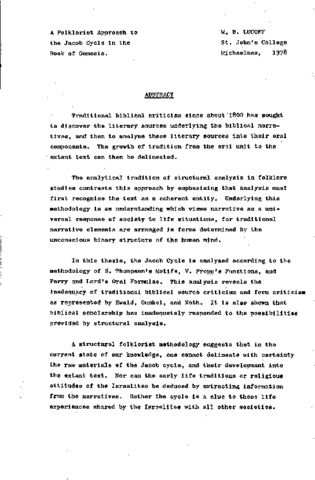 Traditional biblical criticism since about 1800 has sought to discover the literary sources underlying the biblical narratives, and then to analyse these literary sources into their oral components. The growth of tradition from the oral unit to the extant text can then be delineated. The analytical tradition of structural analysis in folklore studies contrasts this approach by emphasising that analysis must first recognise the text as a coherent entity. Underlying this methodology is an understanding which views narrative as a universal response of society to life situations, for traditional narrative elements are arranged in forms determined by the unconscious binary structure of the human mind. In this thesis, the Jacob Cycle is analysed according to the methodology of S. Thompson's Motifs, V. Propp's Functions, and Parry and Lord's Oral Formulae. This analysis reveals the inadequacy of traditional biblical source criticism and form criticism as represented by Ewald, Gunkel, and Noth. It is also shown that biblical scholarship has inadequately responded to the possibilities provided by structural analysis. A structural folklorist methodology suggests that in the current state of our knowledge, one cannot delineate with certainty the raw materials of the Jacob cycle, and their development into the extant text. Nor can the early life traditions or religious attitudes of the Israelites be deduced by extracting information from the narratives. Rather the cycle is a clue to those life experiences shared by the Israelites with all other societies.