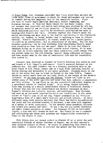 In Ploto today, R.H Crossman conclude that Plat would have abjured the three major forms of government on which the Greek philosopher was invited to comment during his imaginary tour of the twentieth century. Plato was seen to reject Anglo-American democracy, soviet communism, and European fascism. He rejected these ideals for on basic reason; they all assumed that happiness and social well-being were attained by all men in material security and political equality. A “dictatorship of the best which displaced political equality by benevolent paternalism was more in keeping with Plato’s own ideal. Crossman implied that Plato’s model for social well-being was more akin to the English squirearchy of the eighteenth centry, or, indeed, to feudal models than to anything we know in present history. Plato’s ‘squirearchy’, of course, would not be a landed gentry. It would be an aristocracy, - but an aristocracy of the mind. But –we hear Crossman wondering –are we then forbidden from identifying Plato’s model with anything we know from our own past? While it is true that Pluto’s idealism forces us to place his model outside actual history, it is also true that he little supposed that his ideal aristocracy could emerge from any social class but the old Athenian ‘gentry’ whose political influence had been eroded away by the rise of democratic life and the instability that marked it. Crossman thus observed an element in Plato’s thinking that would be root and branch of K.R Popper’s indictment: Plato’s unwonted distrust of the ordinary man. But what Crossman saw as a romantic pessimism akin to the worst fears of W.B Yeats, Popper saw as a high flown cynicism, hateful to fellow feeling and detestable to all moral goodness. Crossman wrote on the eve of the storm that was to break in Europe in the late 1930’s. Popper, driven by racial mania from his own land, wrote at the height of the storm’s violence. In The Open Society and its enemies, Popper saw Plato as the avowed enemy of the moral sanction and trust that must underlie a responsible and free society. He saw Plato as one who sacrificed individual dignity to a groundless theory of ‘natural kinds’. In so doing, Popper believed, Plato was setting up a wholly unverifiable theory of historical destiny –a theory that was not only unverifiable but morally repugnant as well. Popper’s critique was incisive, topical, and passionate. What Crossman had seen as an out-moded paternalism which was insufficient to the needs either of Plato’s time or of our own, Popper conceded as the ferocious megalomania born of a small man’s distrust and selfish conceit. In their different ways, both authors believed that Plato had wholly misunderstood the piety and the profound bravery of Socrates, a man whom both regarded as a martyr to moral conscience. In the deepest sense possible, Socrates was indeed both martyr prejudice to shame. For Crossman he was an inevitable figure, a hero who will always be with us. For Popper he was a stalwart and unflinching man whose very goodness was disgracefully converted by Plato to the vilest of ends. This thesis does not intend either to dispose of or to prove the well considered beliefs beliefs of either Crossman or Popper, two of this century’s most incisive critics of Plato. My object in presenting this theses is more humble. I intend only to consider the growth and the Socratic provenance of Plato's doctrine of political consent. Plato's doctrine of the consent of the governed will be seen to grow from an ideal of personal commitment to moral obligation to an ideal of the perfected state. I believe that we find in Socrates' notion of consent every element basic to the choice a free man makes in obeying laws. But the Socratic teaching would, with whatever result, inspire Plato toward a theory of political idealism which exalts the free man, in imagined historical time, above his fellows. This thesis will have accomplished its purpose if we can trace out Plato's metamorphosis of Socrates from citizen to ruler, while giving due attention at the same time to the theory of political consent which accompanied the change we mention here. While no subject In the Platonic corpus receives more attention than the humanity or the Inhumanity of Plato's politics, I know of no sustained attempts to describe the growth and development of his doctrine of political consent. That doctrine must be basic to all judgements of value we choose to pass upon its author.
