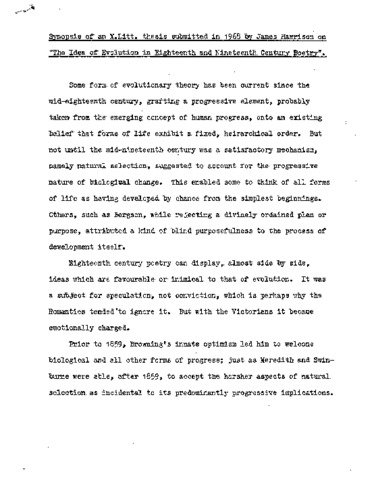 Some form of evolutionary theory has been current since the mid-eighteenth century, grafting a progressive element, probably taken, from the- emerging concept of human progress, onto an existing belief that forms of life exhibit a fixed, hierarchical order. But not until the mid-nineteenth century was a satisfactory mechanism, namely natural selection, suggested to account for the progressive nature of biological change. This enabled some to think of all forms of life as having developed by chance from the simplest beginnings. Others, such as Bergson, while rejecting a divinely ordained plan or purpose, attributed a kind of blind purposefulness to the process of development itself. Eighteenth century poetry can display, almost side by side, ideas which are favourable or inimical to that of evolution. It was a subject for speculation, not conviction, which is perhaps why the Romantics tended' to ignore it. But with the Victorians it became emotionally charged. Prior to 1859, Browning's innate optimism led him to welcome biological, and all other forms of progress; just as Meredith and Swinburne were able, after 1859, to accept the harsher aspects of natural, selection, as incidental to its predominantly progressive implications. Tennyson on the other hand, even before 1859, was by temperament inclined to dwell on the harshness revealed by the new geology and biology; just as Hardy found confirmation of his pessimism in the severities of' Darwinism. After 1859, however, both Tennyson and Browning were repelled by the materialistic implications of Darwinism. Similarly, though Swinburne, Meredith and Hardy accepted these implications, they found it impossible to function as poets within a strictly non-anthropomorphic, non-teleological, materialistically determinist framework of cosmic thought. All three persistently personified the forces of nature in one or more ways, thus vitiating their overt adherence elsewhere to a materialism at which Bergson had likewise baulked.