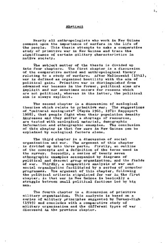 Nearly all anthropologists who work in New Guinea comment upon the importance of warfare in the life of the people. This thesis attempts to make a comparative study of primitive war in New Guinea and trace the significance of certain military characteristics in native society. The subject matter of the thesis is divided up into four chapters. The first chapter is a discussion of the comparative method and anthropological theory relating to a study of warfare. After Malinowski (1941), war is defined as organized hostility with the aim of political gain. Primitive war is distinguished from advanced war because in the former, political aims are implicit and war sometimes occurs for reasons which are not political, whereas in the latter, the political aim is always explicit. The second chapter is a discussion of ecological theories which relate to primitive war. The suggestions of "cultural ecologists" (Vayda 1961, 1971: Rappaport 1968), that people fight when their population density increases and they suffer a shortage of resources, are tested with ecological material, demographic information and ethnographic examples. The conclusion of this chapter is that few wars in New Guinea can be explained by ecological factors alone. The third chapter is a discussion of social organization and war. The argument of this chapter is divided up into three parts. Firstly, an outline of the concepts and a definition of the terms used in the survey. Secondly, a series of twenty seven ethnographic examples accompanied by diagrams of political and descent group organization, and the fields of war. Thirdly, a comparative analysis of war and social organization facilitated by a series of computer programmes. The argument of this chapter, following the political criteria stipulated for war in the first chapter, is that war in New Guinea is basically a struggle between small political factions led by big men. The fourth chapter is a discussion of primitive military organization. This analysis is based on a series of military principles suggested by Turney-High (1949) and concludes with a comparative study of military organization and the different types of war discussed in the previous chapter.