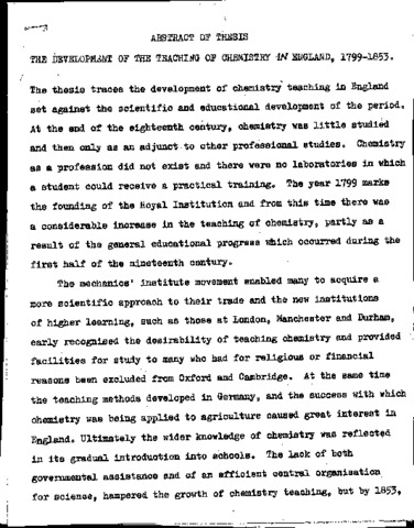 The thesis traces the development of chemistry teaching in England set against the scientific and educational development of the period. At the end of the eighteenth century, chemistry was little studied and then only as an adjunct to other professional studied. Chemistry as a profession did not exist and there were no laboratories in which a student could receive a practical training. The year 1799 marks the founding of the Royal Institution and from this time there was a considerable increase in the teaching of chemistry, partly as a result of the general educational progress which occurred during the first half of the nineteenth century. The mechanics' institute movement enabled many to acquire a more scientific approach to their trade and the new institutions of higher learning, such as those at London, Manchester and Durham, early recognised the desirability of teaching chemistry and provided facilities for study to many who had for religious or financial reasons been excluded from Oxford and Cambridge, At the same time the teaching methods developed in Germany, and the success with which chemistry was being applied to agriculture caused great interest in England, Ultimately the wider knowledge of chemistry was reflected in its gradual introduction into schools. The lack of both governmental assistance and of an efficient central organisation for science hampered the growth of chemistry teaching, but by 1855.