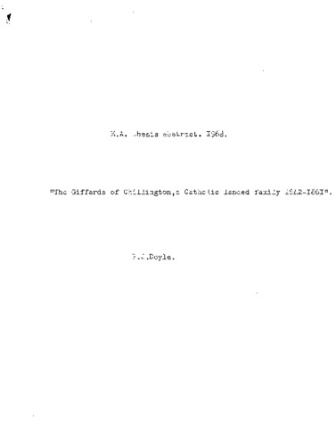 This thesis explores the economic and political effects on the Giffards of three centuries of recusancy, their contribution to the organisation of Catholicism in the Midlands, and to the priesthood and the religious life. Further it examines the exclusiveness of the recusant community, and attempts to explain why the Giffards, like so many other recusant families, ceased to be Catholic in the nineteenth century. The introduction outlines the origins of the family s recusancy, but 1642 is the commencing date. During the Civil War the Giffards distinguished themselves in the Royalist cause, and were instrumental in the saving of Charles II after the battle of Worcester. Their loyalty was rewarded by a partial dispensation from the penal laws, but it was not until their discharge from the double land tax in 1851 that the Giffards were finally relieved from all religious disabilities. The terminal date of 1861 marks the death of the last Catholic squire. The Civil War resulted in the sequestration of the Chillington estate; otherwise their recusancy had little effect on the family's fortune indeed in the eighteenth century their rental increased remarkably. The crisis, which beset the estate in 1790, was a result of extravagance, in particular the rebuilding of Chillington Hall. Therefore the last decade of the eighteenth and the nineteenth century was a period of retrenchment and land sales. The family had mining interests in Stow Heath, Wolverhampton, and the inheritance of the Plas Ucha and Nerquis estates on the North Wales coalfield, and the intersection of the Staffordshire properties by canal & railway increased their interest in industrialism and shareholding. But the Giffards remained essentially landed proprietors. The greatest change was from Cisalpine Catholics to Tory Anglicans.