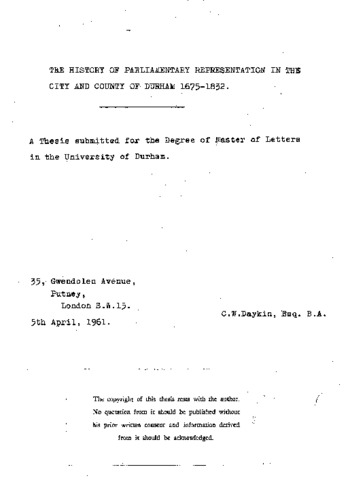 The history of parliamentary representation in the city and county of Durham 1675-1832