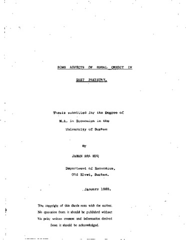 The poverty of farmers and the backwardness of agriculture are both cause and effect of a lack of capital, and crediting the, rural areas of East-Pakistan. They are cause because they make it almost inevitable that when loans are obtained they are misused, and consequently potential lenders are chary of putting their money into agriculture. They are the effect of a lack of credit and capital in the sense that changes in methods which might increase agricultural productivity have been held up for lack of finance. These considerations have not, however, prevented farmers from becoming heavily indebted and this study examines the purposes for which money is borrowed in the rural areas and the sources of finance. It shows that most of the rural debt is owed to non-institutional lenders of one kind or another and that the institutional lenders - banks, agricultural credit institutions, co-operative credit institutions etc - have made very little contribution to the total supply of credit. The study concludes with an estimate of total credit requirements and argues that if the gap between supply and requirements is to be met, institutional lending will have to be greatly increased.