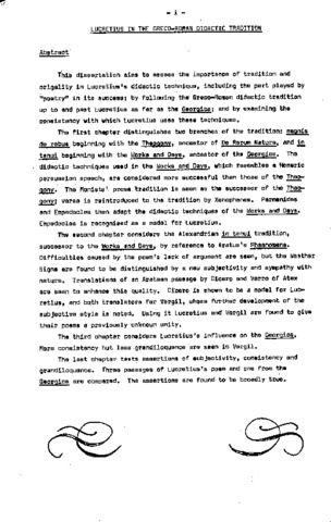 This dissertation aims to assess the importance of tradition and origality in Lucretius»s didactic technique, including the part played by "poetry" in its success? by following the Greco-Roman didactic tradition up to and past Lucretius as far as the Georgics; and by examining the consistency with which Lucretius uses these techniques. The first chapter distinguishes two branches of the tradition: maqnis de rebus beginning with the Theogony ancestor of De Rerum Nature, and in tenui beginning with the works and Days, ancestor of the Georgics. The didactic techniques used in the Works and Days, which resembles a Homeric persuasion speech, are considered more successful than those of the Theoqony. The Monists' prose tradition is seen as the successor of the Theoqony; verse is reintroduced to the tradition by Xenophanes. Parmenides and Empedocles then adapt the didactic techniques of the Works and Days. Empedocles is recognised as a model for Lucretius. The second chapter considers the Alexandrian in tenui tradition, successor to the Works and Days, by reference to Aratus's Phaenomsna. Difficulties caused by the poem's lack of argument are seen, but the Weather Signs are found to be distinguished by a new subjectivity and sympathy with nature. Translations of an Aratean passage by Cicero and Varro of Atax are seen to enhance this quality. Cicero is shown to be a model for Lucretius, and both translators for Vergil, whose further development of the subjective style is noted. Using it Lucretius and Vergil are found to give their poems a previously unknown unity. The third chapter considers Lucretius's influence on the Georgics. More consistency but less grandiloquence are seen in Vergil. The last chapter tests assertions of subjectivity, consistency and grandiloquence. Three passages of Lucretius's poem and one from the Georqics are compared. The assertions are found to be broadly true.