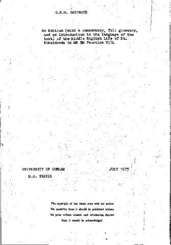 An edition (with a commentary, full glossary, and an introduction to the language of the text) of the Middle English life of St. Etheldreda in MS B.M Faustina B 111