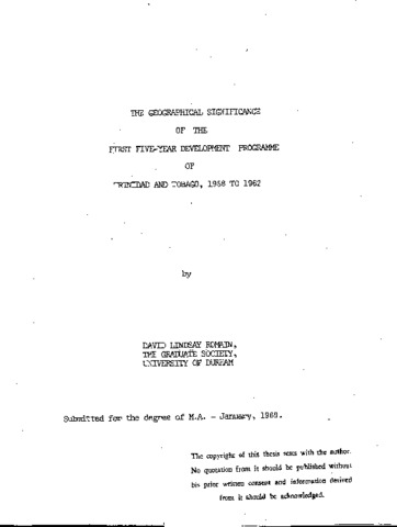The geographical significance of the first five-year development programme of Trinidad and Tobago 1958 to 1962.