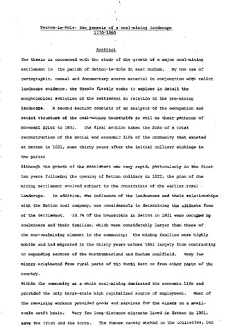 Hetton-Le-Hole: the genesis of a coalmining landscape 1770-1860
