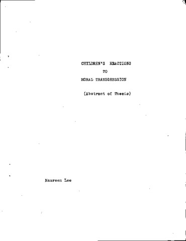 Research into moral development in children was for many years based upon the theories of Piaget and Freud. The former emphasised the cognitive aspects of development, seeing the formation of mature moral judgments largely as a function of the mental age of the child. Freud, on the other hand, concentrated upon the child's early dependence on the parents and consequent identification with them which led to the assimilation of their prohibitions and ideals. Later the proponents of Learning Theory suggested that the basis of moral behaviour was the establishment of conditioned reflexes which were generalised by the child to apply to many situations. The present study reviews recent work in these fields and examines such concepts as internalisation, conscience and guilt which are inherent in contemporary theories. An investigation was undertaken into the different responses to transgression made by groups of boys and girls aged 9, 12, and 14 years. The method used was a story-completion test administered to a total sample of 322 children. The story-endings were then statistically analysed. The most frequently occurring response was the anticipation of discovery and punishment, which was taken to indicate the effectiveness of early conditioning. As the age of the child increased there was a marked decline in the consistency of individual responses. The explanation offered for this phenomenon is that the child develops from unilateral respect to a morality based on cooperation, and in so doing becomes aware of more subtle aspects of each situation so that a greater variety of behaviour can be justified. In the higher age groups significantly more reference to confession, apology and reparative techniques were made by girls than by boys. It is suggested that one of the main reasons for this is the girls' particular social experience which seems to indicate to them the appropriateness of certain actions.