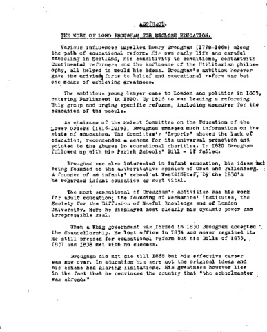 Various influences impelled Henry Brougham (1778-1868) along the path of educational reform. His- own early life and careful schooling in Scotland, his sensitivity to conditions, contact with Continental reformers and the influence of the Utilitarian philosophy, all helped to mould his ideas. Brougham's ambition however gave the driving force to belief and educational reform was but one means of achieving greatness. The ambitious young lawyer came to London and politics in 1805, entering Parliament in 1810. By 1816 he was leading a reforming Whig group and urging specific reforms, including measures for the education of the people. As chairman of the Select Committee on the Education of the Lower Orders (1816-1818), Brougham amassed much information on the state of education. The Committee's "Reports" showed the lack of education, recommended a scheme for its universal promotion and pointed to the abuses in educational charities. In 1820 Brougham followed up with his Parish Schools' Bill - it failed. Brougham was also interested in infant education, his ideas being founded on the authoritative opinion of Owen and Fellenberg. A founder of ah infants' school at Westminster, by the 1830's he regarded infant education as most vital. The most sensational of Brougham's activities was his work for adult education; the founding of Mechanics' Institutes, the Society for the Diffusion of Useful Knowledge and of London University. Here he displayed most clearly his dynamic power and irrepressible zeal. When a Whig government war formed in 1830 Brougham accepted the Chancellorship. He lost office in 1834 and never regained it. He still pressed for educational reform but his Bills of 1835, 1837 and 1838 met with no success. Brougham did not die till 1868 but his effective career was now over. In education his were not the original ideas and his scheme had glaring limitations. His greatness however lies in the fact that he convinced the country that "the scnoolmaster was abroad."